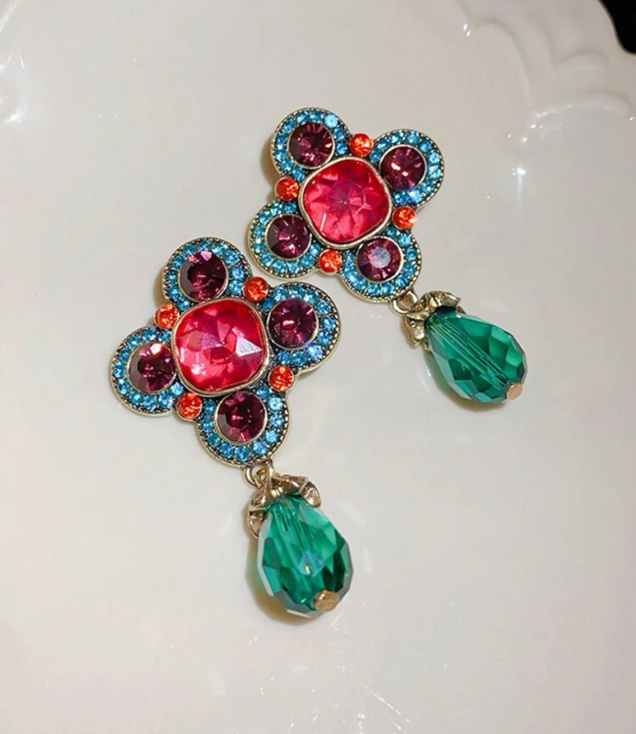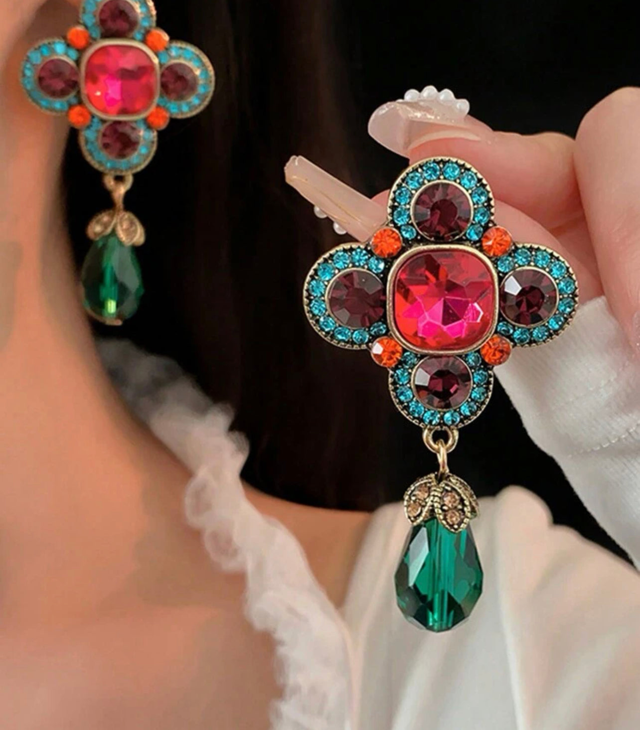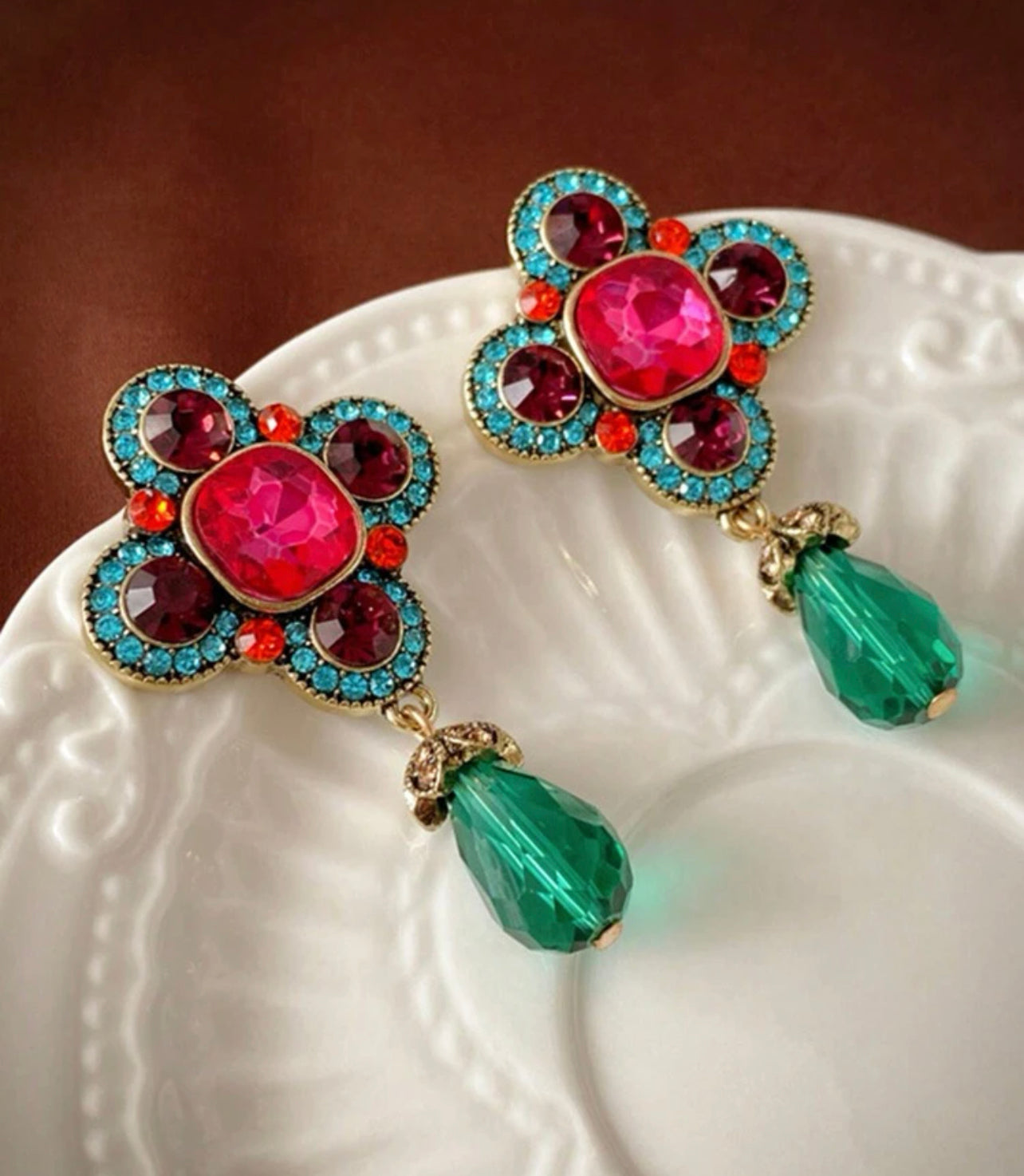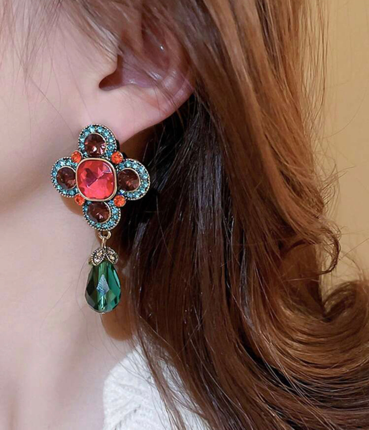 Fashionabla vintageörhängen i modern stil med färgrika ädelstenar.