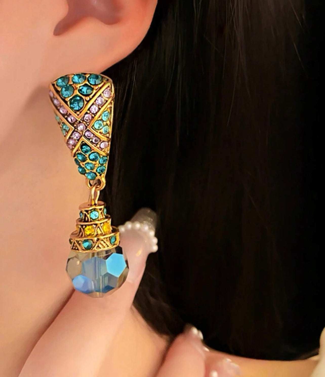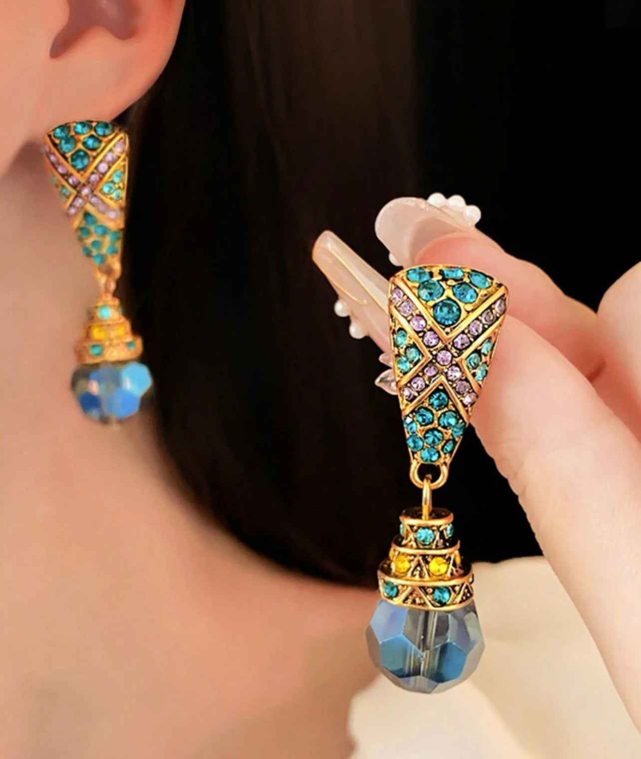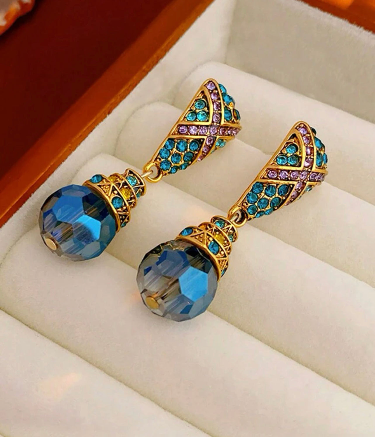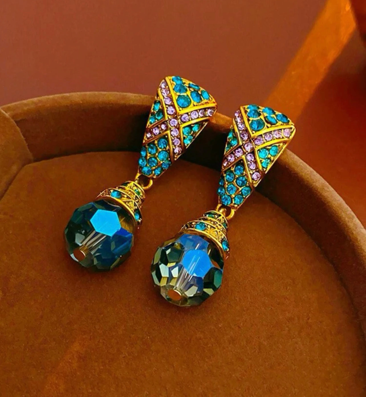 Guldplätterade örhängen i retro stil med färgad ädelstensdekor